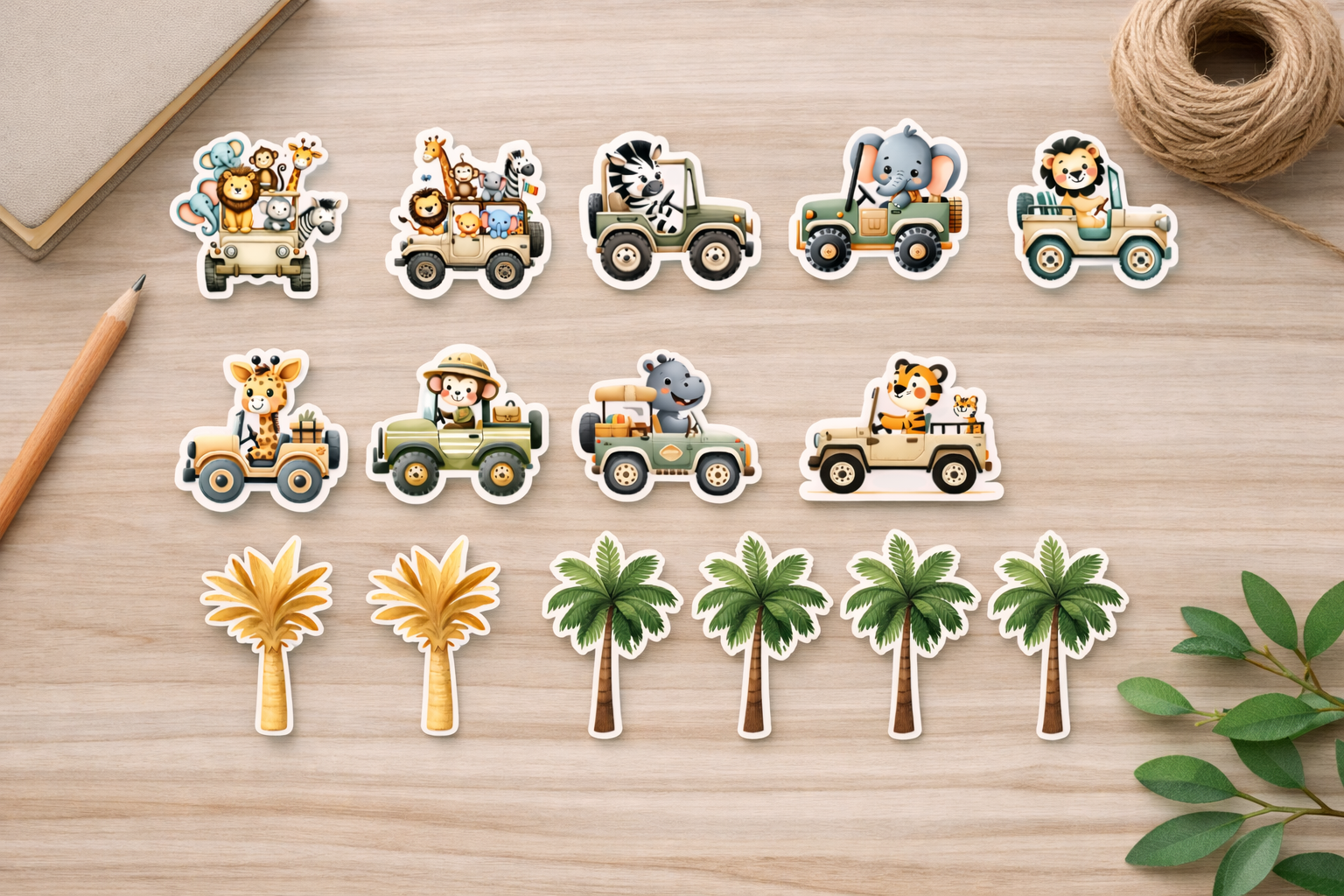 Bring playful safari vibes to your crafts with this adorable Safari Adventure Sticker Set. Featuring colourful animal‑themed cars (lions, giraffes, elephants, zebras, monkeys and more) plus matching palm trees, this set is perfect for decorating journals, scrapbooks, laptops, kids’ projects and gift packaging.