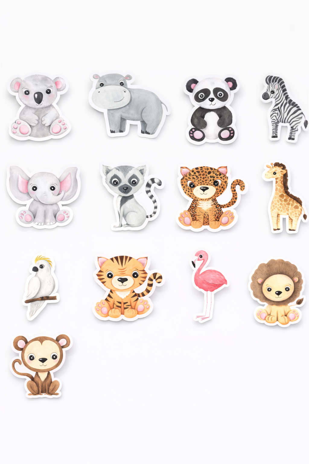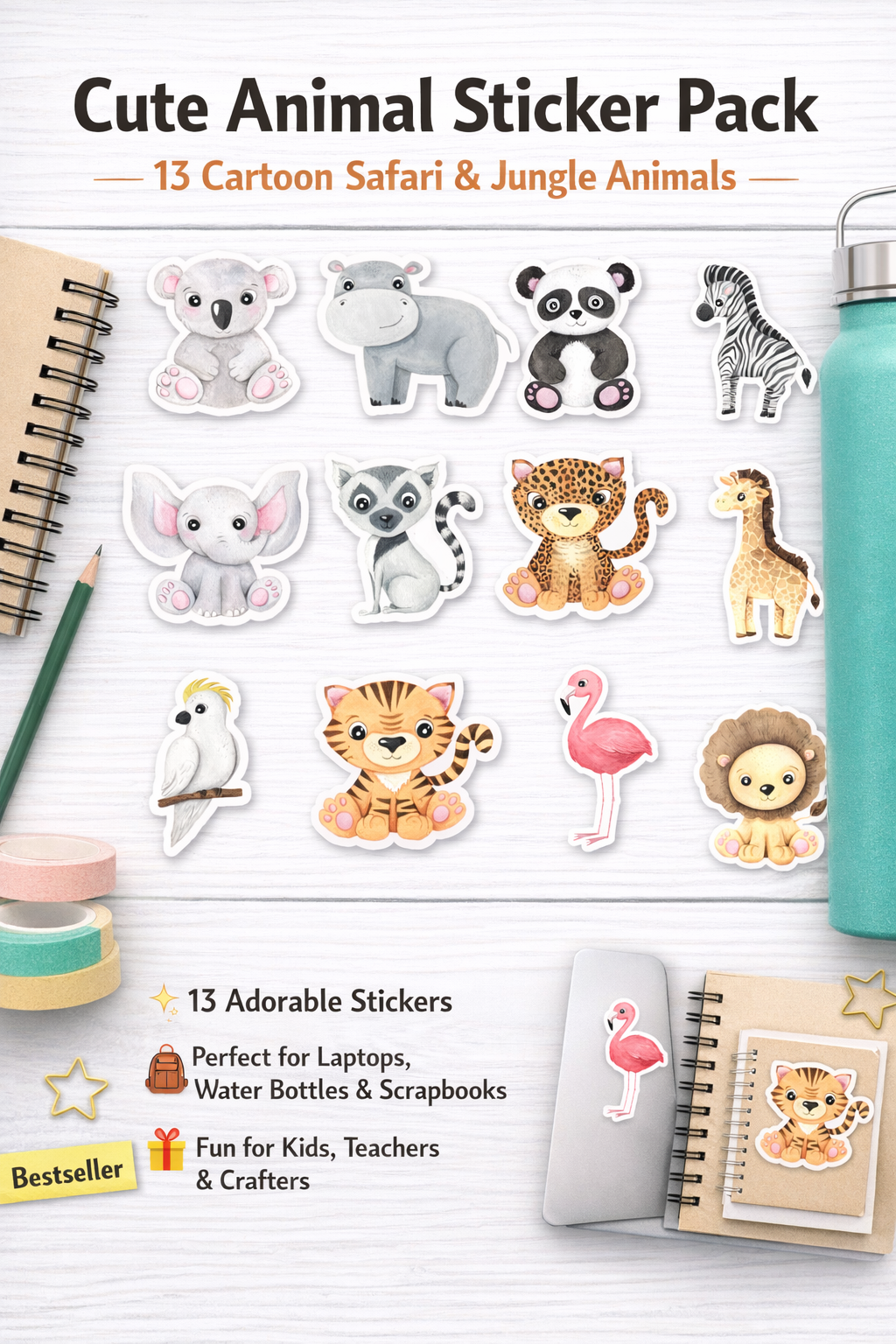 Brighten any surface with this adorable set of 13 cartoon animal stickers, featuring favourites like the koala, panda, tiger, lion, giraffe, zebra, and more. Each sticker has a colourful, friendly design perfect for kids, classrooms, scrapbooks, laptops, water bottles, and craft projects.