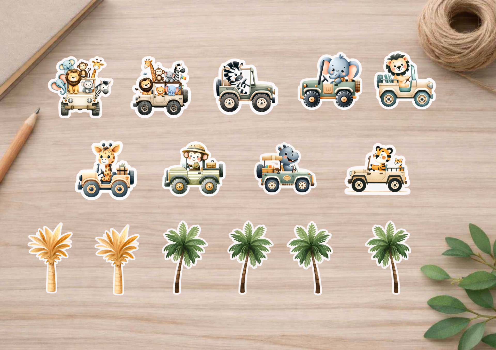 Bring playful safari vibes to your crafts with this adorable Safari Adventure Sticker Set. Featuring colourful animal‑themed cars (lions, giraffes, elephants, zebras, monkeys and more) plus matching palm trees, this set is perfect for decorating journals, scrapbooks, laptops, kids’ projects and gift packaging.