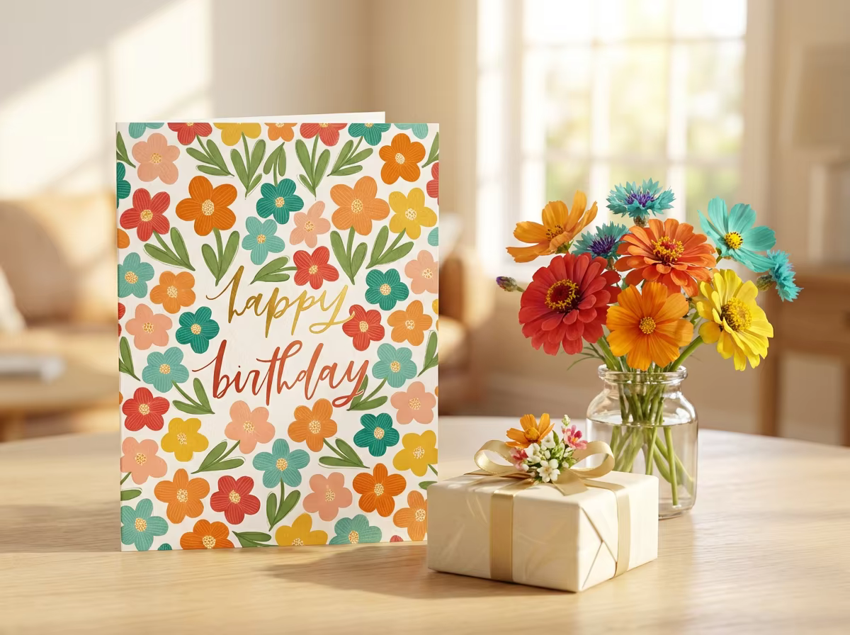 Make their birthday extra special with this exclusive hand‑designed Happy Birthday greeting card, created by us and unavailable in any store. Featuring a vibrant floral illustration, this unique card brings a cheerful, modern aesthetic that stands out from mass‑produced designs.