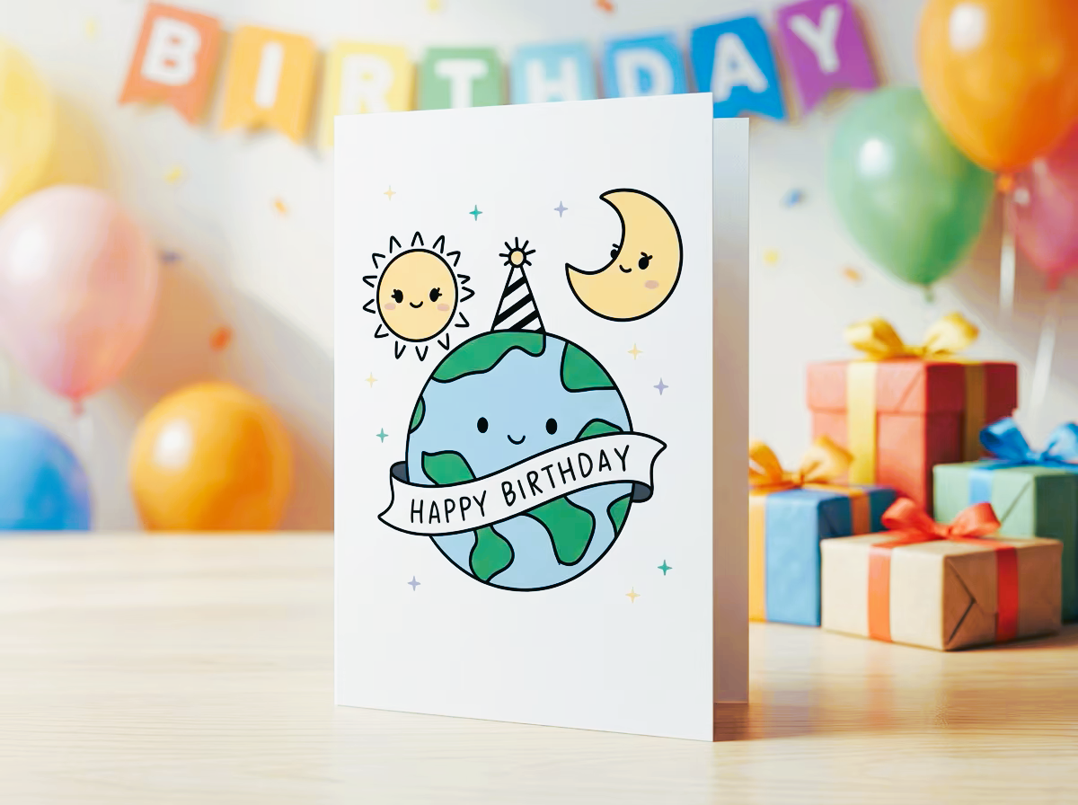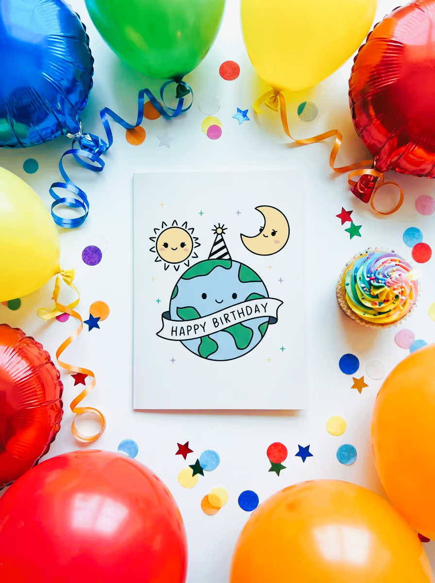 This adorable birthday card features a smiling Earth wearing a party hat, joined by a cheerful Sun and Moon — a charming trio ready to brighten anyone’s celebration. It’s the perfect choice for kids, teens, and anyone who loves cute space‑themed designs.