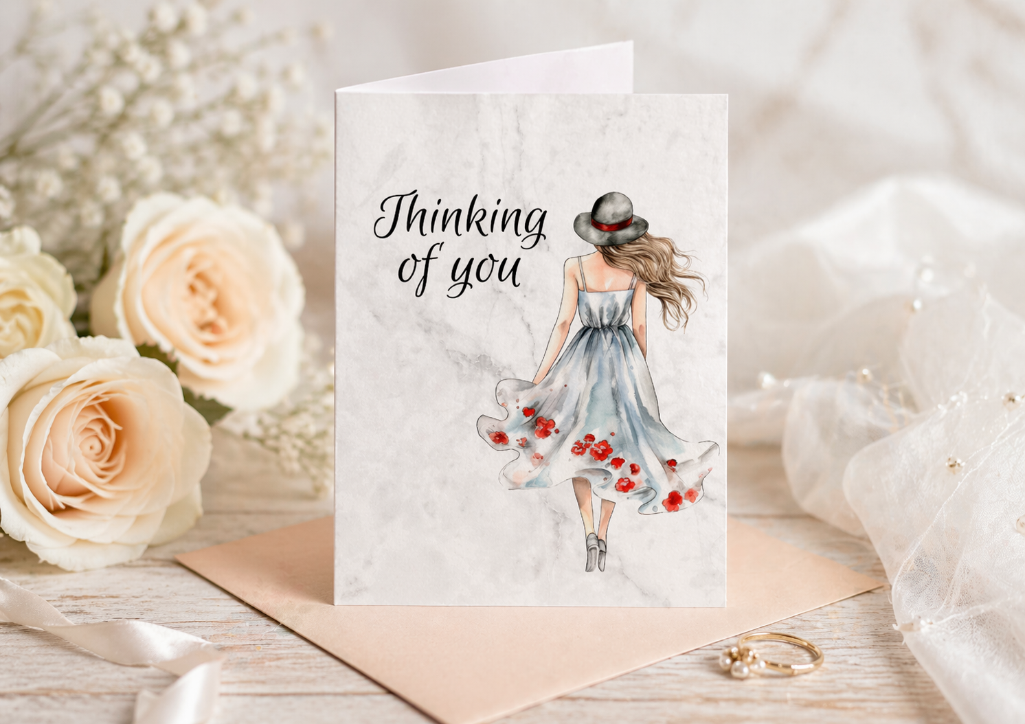 Let someone special know they’re on your mind with this beautifully illustrated “Thinking of You” card. Featuring a serene figure in a flowing floral dress and soft pastel tones, this design captures comfort, care, and quiet strength. Perfect for sending support, sympathy, encouragement, or simply a heartfelt hello.