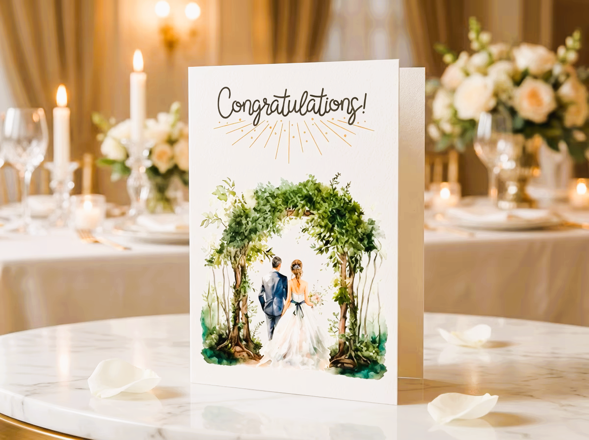 Celebrate life’s most meaningful moments with this elegant “Congratulations!” wedding card, featuring a beautifully illustrated couple walking beneath a lush green archway. Refined artwork creates a timeless, romantic feel — perfect for weddings, engagements, and anniversaries.